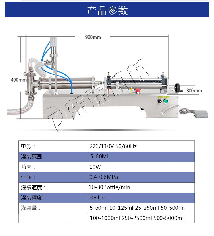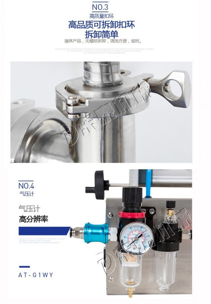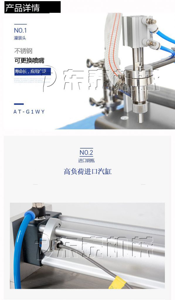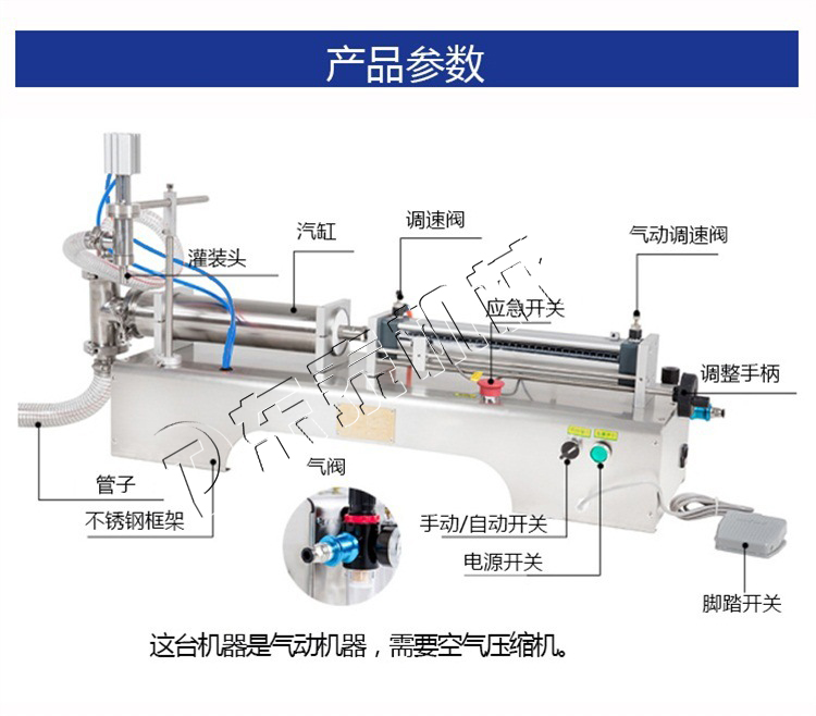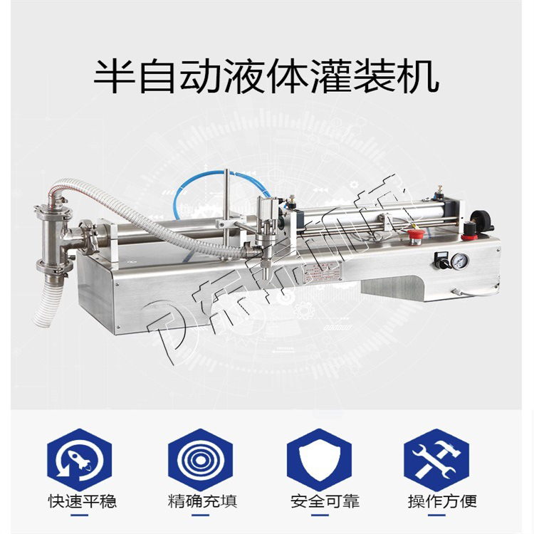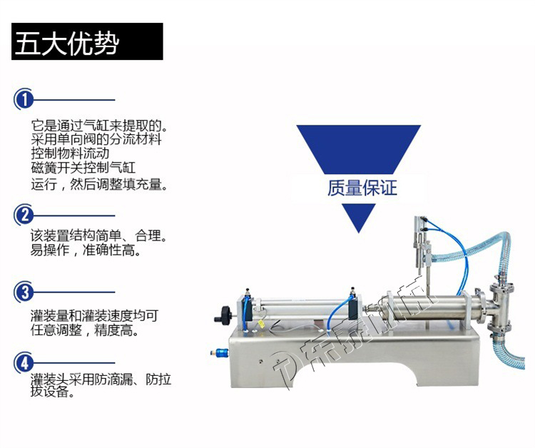 小型液體定量灌裝機,通過氣缸帶動一個活塞來抽取和打出物料,用單項閥控制物料流向,小型液體定量灌裝機用磁簧開關控制氣缸的行程,即可調(diào)節(jié)灌裝量。