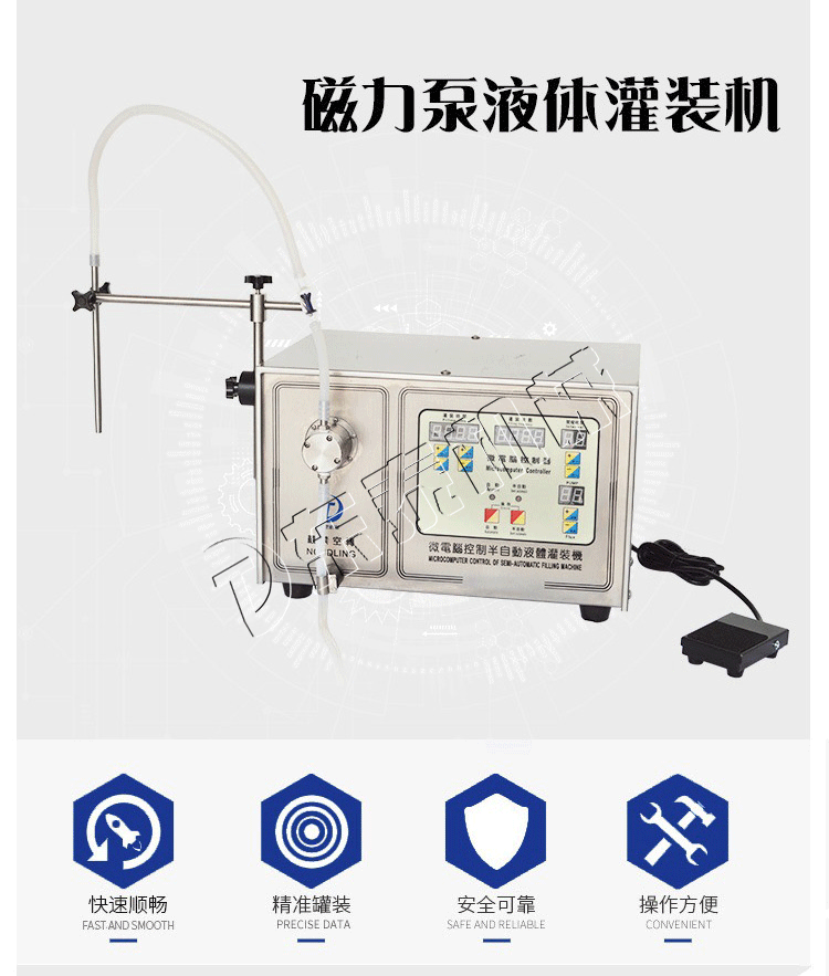 醫(yī)用小型液體灌裝機(jī)又叫小型磁力泵灌裝機(jī)可灌充絕大類型的液體,包括高粘稠度的液體。醫(yī)用小型液體灌裝機(jī)是利用位電腦對(duì)微型水泵在灌裝時(shí)間、電機(jī)轉(zhuǎn)速等因素上的控制,達(dá)到均勻的、重復(fù)誤差極小的液體灌裝方式,廣泛的應(yīng)用于藥物、化工、食品、飲料、油脂、化妝品等行業(yè),適用于低粘度、無顆粒的液體分裝、小批量生產(chǎn)。